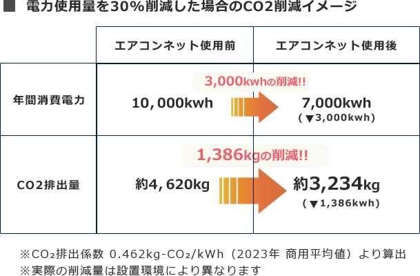 年間10,000kWhの電力を使用する業務用エアコンにエアコンネットを導入した場合、約30%の節電が可能。
